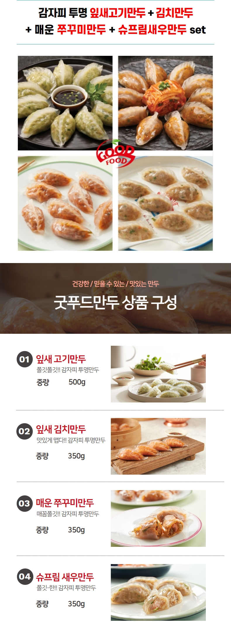 - HOME > 전체상품 > 굿푸드 만두 감자피 투명 잎새 고기만두 500g + 매꼼 김치만두 350g + 매운미친 쭈꾸미만두 350g + 슈프림새우만두 350g 4봉 세트
